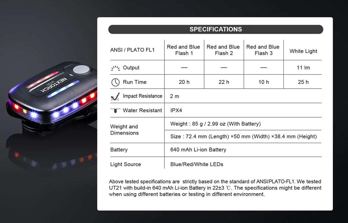 El UT21 tiene una función de modo doble, flash (STROBO) rojo-azul y luz blanca,